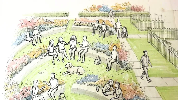 One of several lush green oases designed for picnics, outdoor activities, and relaxation.